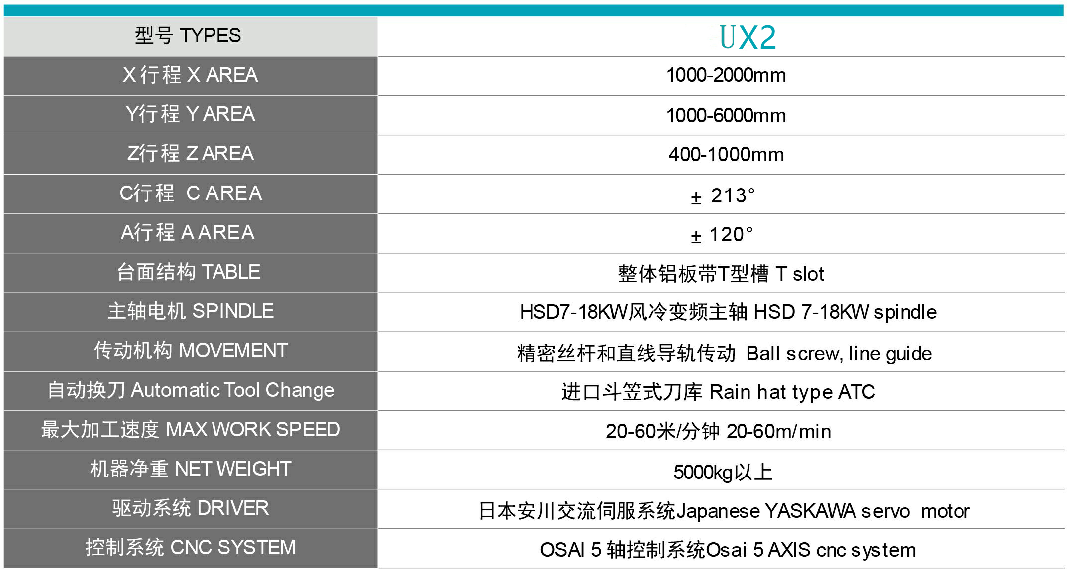 原力UX2五轴加工中心,真正五轴插补RTCP功能,台湾PMI丝杆和导轨,保证了精细雕刻。意大利HSD7-18KW360度风冷变频主轴电机。经过高温回火去应力后进行两次精密加工而成,属重切削型加工,床身经久耐用。自动报警功能,自动润滑系统,意大利OSAI-5轴控制系统。
