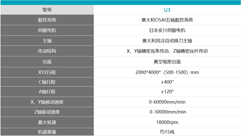 原力U3是动梁式大型龙门五轴加工中心,采用落地式设计,Z轴行程较大,适用于较大尺寸材料的加工。一次装夹工件可连续